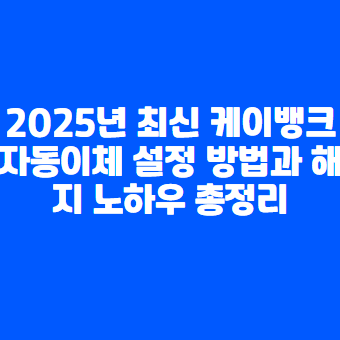 케이뱅크 자동이체 신청과 해지 방법을 상세히 알아봅니다. 모바일 앱을 통한 간편한 자동이체 등록 과정, 수수료 면제 혜택, 자동이체 처리 시간 및 해지 방법까지 케이뱅크 자동이체 서비스의 모든 것을 한 번에 확인하세요. 케이뱅크 앱으로 편리하게 금융 생활을 관리하는 방법을 소개합니다.