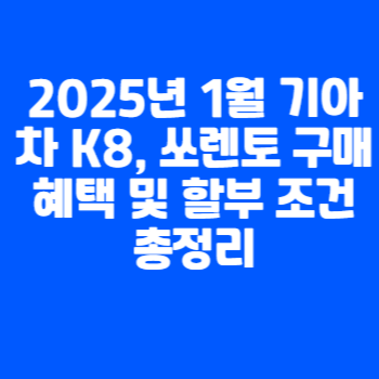 2025년 1월 기아자동차의 K8과 쏘렌토 모델을 위한 특별 프로모션 및 할부 조건을 확인하세요. 저금리 할부, 할인 혜택, 출고 대기 기간 등 상세 정보 제공.